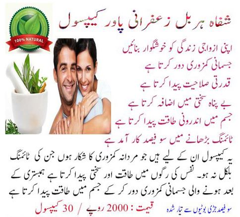 Zafrani Herbal Capsule Mardana Kamzori Ka Tasalii Bakhash Ilaaj Hai Money Ko Garha Karta Hai, Timing Mein Izafah Karta Hai. Vigra Jaisi Muzir Sehat Adwiyaat Se Hamesha Ke Liye Jaan Churaye Aur Desi Tarika Ilaaj Apnayen. Vigra Chand Lamhaat Ko Khushgawar To Banati Hai Lekin Es Ke Sath Sath Aap Ke Gurdon Ko Tabah Karti Hai Lakin Ab Fikar Mand Honay Ki Zarorat Nahi Zafrani Ki Taraf Se Is Masly ka Mukamal Mustand Hal Zafrani Herbal Capsule Ki Soorat Mein Hai.Pooray Pakistan Me Mangwane Ke Liye Call Ya WhatsApp Karen۔